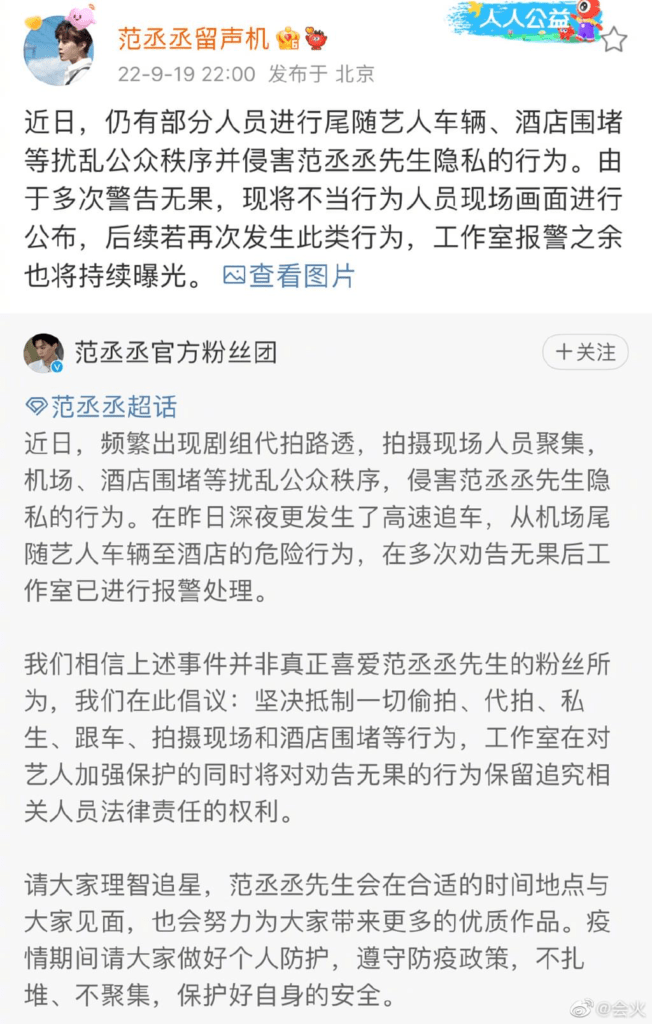 Mới đây, studio của Phạm Thừa Thừa đã đăng tải hình ảnh của sasaeng fan lên weibo và nghiêm khắc lên án những hành vi của cô gái này. Theo thông tin đăng tải, cô đã bám đuôi xe và ‘bao vây’ Phạm Thừa Thừa tại khách sạn, gây ảnh hưởng nghiêm trọng đến trật tự công cộng và xâm phạm quyền riêng tư của nam nghệ sĩ.