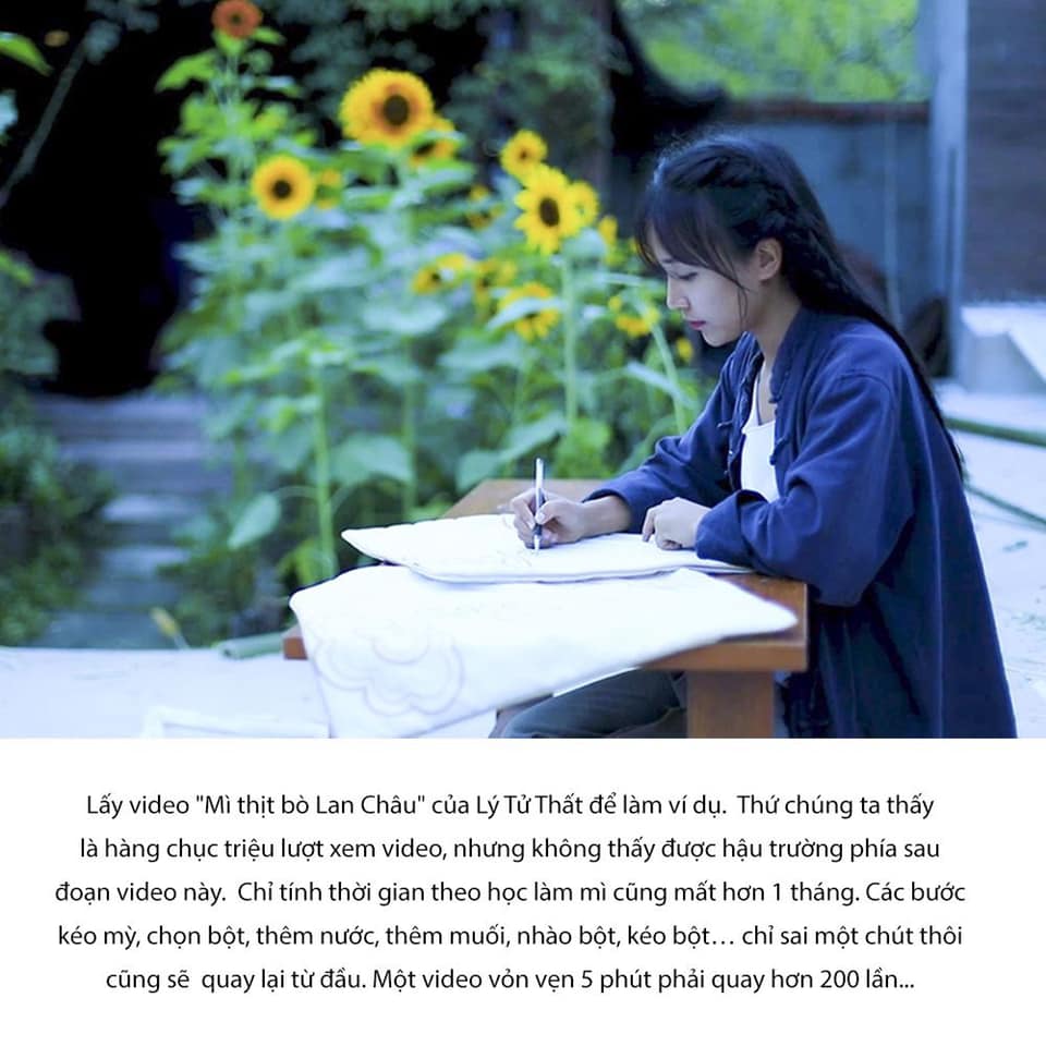 Lấy video “Mì thịt bò Lan Châu” mà cô phát hàng vào tháng 11/2016 để làm ví dụ. Video này là điểm sáng góp phần khiến tên tuổi của Lý Tử Thất bùng nổ và phổ biến khắp mạng xã hội, thứ chúng ta thấy là hàng chục triệu lượt xem video, nhưng điều mà không nhiều người thấy được chính là hậu trường phía sau đoạn video chỉ dài chưa đầy 5 phút này.