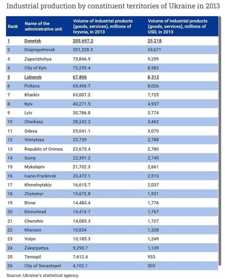 Tỉnh Donetsk dẫn đầu với 25,2 tỷ USD, Luhansk đứng thứ 5 với 8 tỷ USD, chỉ 2 tỉnh nay đã chiếm 25% tổng sản lượng công nghiệp của Ukraina. Đây là điều dễ hiểu vì Donbass được xây dựng từ thời Đế quốc Nga và Liên Xô, với lợi thế của mỏ than vùng Donbass hỗ trợ cho các cơ sở công nghiệp nặng mà Ukraina được thừa hưởng sau khi Liên Xô tan rã. Sự giàu có, nền tảng công nghiệp to lớn và gần gũi về mặt dân tộc và văn hóa với nước Nga giải thích lý do người Donbass tách ra ly khai và chiến đấu 8 năm trời với chính quyền Maidan.