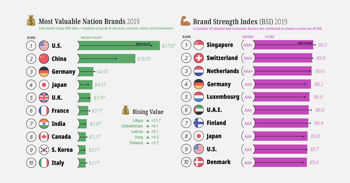 Mỗi nước thường có thế mạnh nổi trội trong một lĩnh vực nào đó: đồ gia dụng, dụng cụ gia đình, xe cộ thì khó ai qua được Đức, xa xỉ phẩm phục vụ niềm vui sống thì Pháp vẫn xuất hiện đầu tiên, đồ gia dụng của Nhật thì khỏi phải bàn về chất lượng và sự tiện dụng. Ngoài chất lượng, giá cả thì các yếu tố lịch sử, địa chính trị cũng rất quan trọng. Nhiều hãng máy giặt muốn bán cho các nước Ả rập thì phải bỏ tiếng Hebreu ra khỏi hướng dẫn sử dụng. Hãng ô tô Subaru đã chấp nhận mất thị trường các nước Ả rập khi bán xe ở Israel (vi phạm lệnh tẩy chay Israel của thế giới Ả rập thời bấy giờ). Điều này được thực hiện từ 1969 đến cuối thập niên 80 khi tình hình quan hệ giữa hai bên đã được cải thiện.
