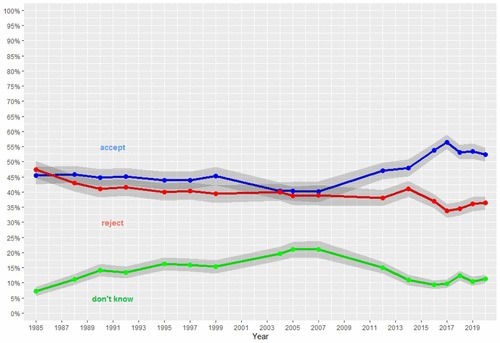 Từ năm 1985, người Mỹ ở độ tuổi trưởng thành được chiêu mộ tham gia khảo sát để trả lời rằng họ đồng ý hay không đồng ý với mệnh đề: “Con người, như chúng ta biết ngày này, phát triển từ những loài động vật trước đây.”/“Human beings, as we know them today, developed from earlier species of animals.”