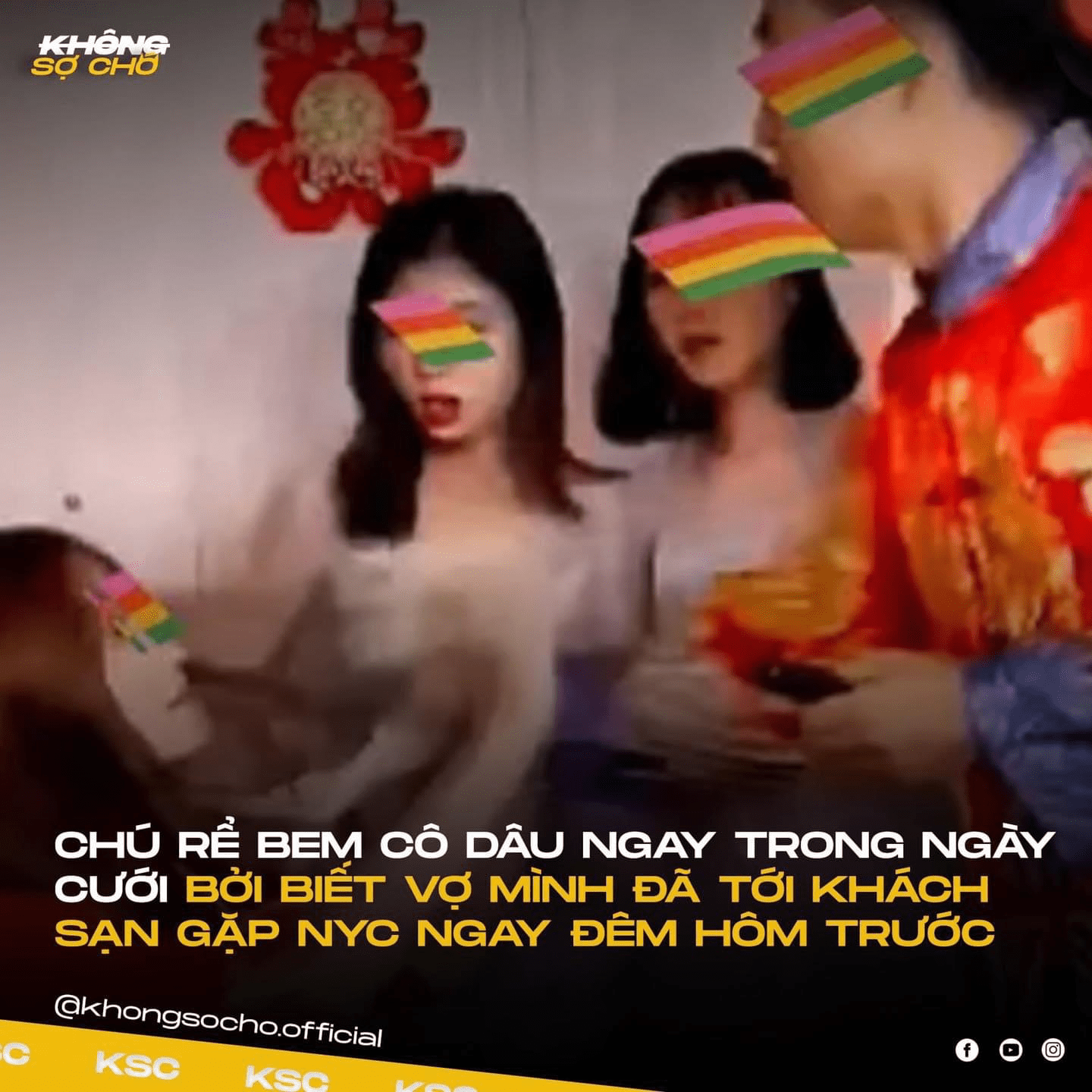 Thấy vậy, cô dâu hoảng hốt: “Anh phải nghe em lói đã. Đây là bạn trai cũ của iem, iem cũng nói với anh rồi đó. Hôm qua anh ta đi công tác về, biết iem sắp lấy chồng nên qua đây muốn gặp mặt em. Bọn em chỉ nói chuyện, ăn cơm rồi về thôii”.