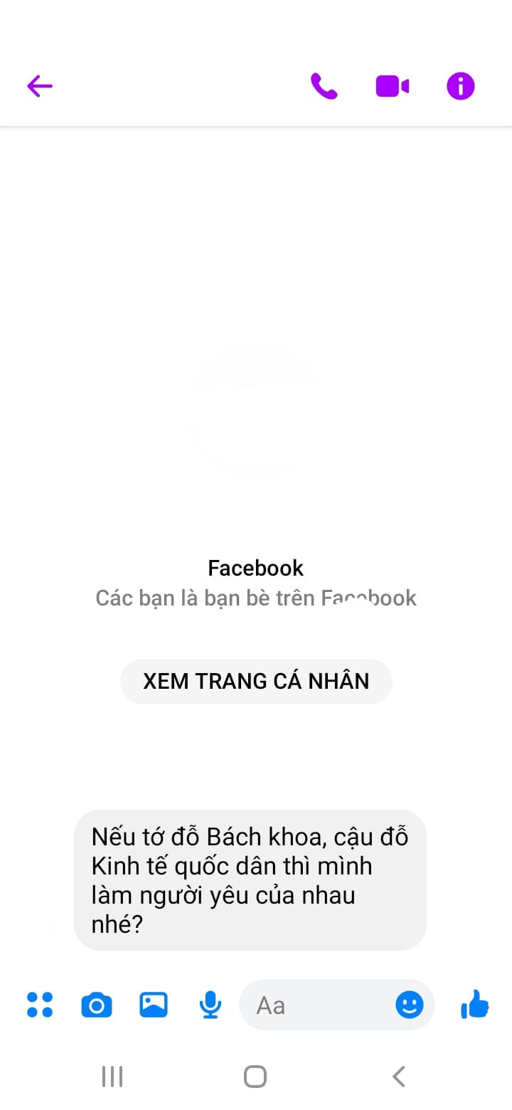 Ngày gần thi Đại học cậu đã nhắn tớ thế này: Nếu cậu đỗ Bách khoa, tớ đỗ Kinh tế quốc dân thì mình yêu nhau nhé. Tớ mừng lắm. Với tớ nó như một lời tỏ tình cũng như là một động lực vô cùng to lớn với tớ trong khoảng thời gian rất khó khăn và áp lực ấy. Tớ đã cố gắng thật nhiều để có thể thi đỗ Đại học Kinh tế quốc dân là ngôi trường mà tớ mơ ước cũng như để thay lời đáp lại lời tỏ tình của cậu.