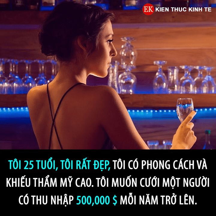 TÔI 25 TUỔI, TÔI RẤT ĐẸP, TÔI CÓ PHONG CÁCH VÀ KHIẾU THẨM MĨ CAO. TÔI MUỐN CƯỚI MỘT NGƯỜI CÓ THU NHẬP 500.000$ MỖI NĂM TRỞ LÊN