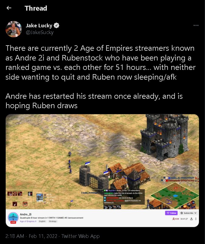 Tại thời điểm viết bài này, ngưởi chơi Romania Andre_2i và người chơi Phần Lan Rubenstock đã trải qua hơn… 86 giờ (tính theo đồng hồ trong trò chơi – nhanh hơn 1,7 lần so với thời gian thực), tức là gần 51 giờ ngoài đời thực. Tin tức về trận đấu Age of Empires II của họ lần đầu tiên trở thành xu hướng phổ biến khi phóng viên thể thao điện tử Jake Lucky đưa tin trên Twitter của anh ấy.