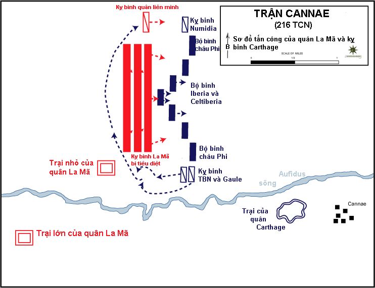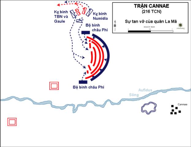 Đội kị binh Numidian (hiện nay là vùng đất thuộc Algerie – ND) là cánh quân đã chịu phần lớn trách nhiệm về các phần việc “nặng nhọc”. Họ đột kích kẻ thù (nhưng không vào quá gần) phi giáo vào quân La Mã và sau đó vòng trở lại ra ngoài để nạp lại “đạn” và vòng quay lại tiếp diễn. Vào mỗi lượt tấn công như vậy, đội hình La Mã vòng ngoài khiếp sợ đến nỗi họ không hề dám chiến đấu chống lại và thay vào đó là tìm cách chạy trốn. Họ không thể chạy một mình, cả quân đội La Mã cũng không thể cùng di chuyển rút lui ra hướng khác (vì hướng còn lại của họ là một rừng mũi giáo nhọn của quân đội Carthage), do đó những người lính vòng ngoài càng ngày càng cố gắng lùi sâu hơn nữa vào phía trong đội hình của họ.