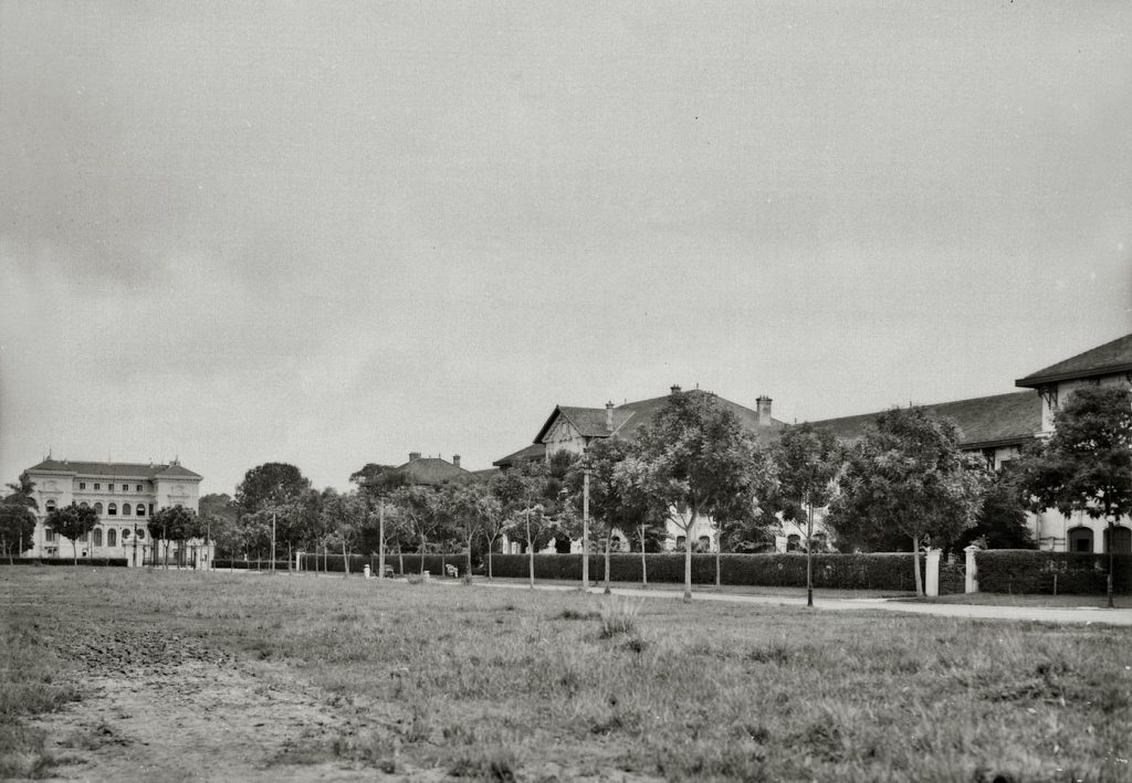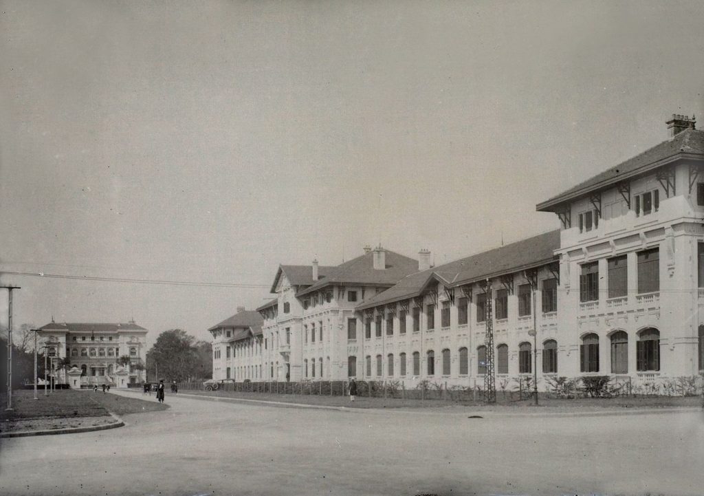 Mặc dù gặp khó khăn do Thế chiến I (1914 – 1918), năm 1914 công trình vẫn được khởi công trên một khuôn viên rộng, vuông vắn, nằm trước Phủ Toàn Quyền, tiếp giáp với đại lộ Cộng Hòa (Avenue de la République) sau đổi là Honoré Tissot, nay là phố Hoàng Văn Thụ, đại lộ Brière de l’Isle nay là phố Hùng Vương, đại lộ Carnot nay là phố Phan Đình Phùng, và phố Destenay nay là phố Nguyễn Cảnh Chân; cổng chính nhìn ra đại lộ Cộng Hòa. Công trình do kiến trúc sư Adolphe Bussy thiết kế gồm khu trường chính (khu học đường, khu hiệu bộ, khu nội trú – y tế) và khu giáo dục thể chất, hoạt động thể dục thể thao. Khu học đường và khu hiệu bộ đều nằm trong 2 dãy nhà cao 2 – 3 tầng được xây song song với đại lộ Cộng Hòa; giữa 2 dãy nhà này là 2 sân chơi ngoài trời rộng, ngăn cách bởi một giàn cây hình vòm xanh mát, giữa có treo chiếc chuông để đánh báo giờ. Giáp đầu ngoài 2 sân có 2 nhà chơi khá lớn kèm hàng chục phòng tắm có gương sen. Khu nội trú – y tế nằm trong dãy nhà thứ 3 ở phía sau dãy thứ 2, các hành lang có mái che lợp ngói nối liền 2 dãy nhà này với nhau. Một cổng phụ mở ra trên phố Destenay đón học sinh đến học hàng ngày, đồng thời cho phép thầy trò dễ dàng đi sang khu giáo dục thể chất. Khoảng năm 1948 mở thêm một cổng phụ nữa nhìn ra đại lộ Brière de l’Isle. Khu giáo dục thể chất gồm sân quần vợt, sân bóng đá, sân bóng rổ, sân bóng chuyền, khu điền kinh (hố cát để tập nhảy cao, nhảy xa, xà đơn, xà kép, xà lệch…), ngăn cách với khu trường chính bởi phố Destenay. (Từ năm 1954 khu này đã được dùng để xây trụ sở Ban Tuyên Giáo trung ương còn khu trường chính được dùng làm trụ sở Trung ương Đảng CS Việt Nam).