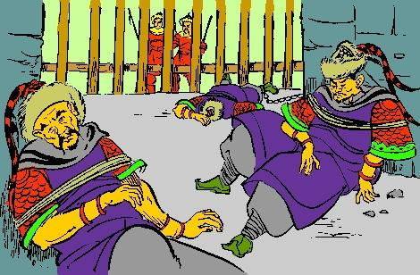 Nói xong  Sư Tích xin phép lấy giấy mực để viết hai vế câu đối rồi đọc to cho vua Minh cùng các quan cùng nghe, đối rằng :