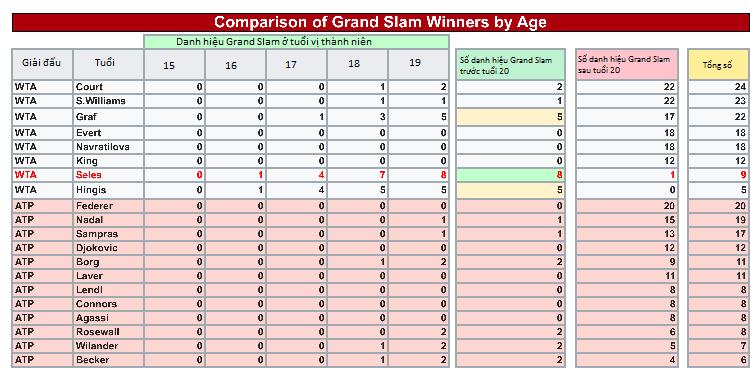 Tôi đã soạn bảng dưới chỉ để minh họa những thành tựu đáng kinh ngạc của Seles khi so sánh với những cái tên mà chúng ta thường nghe thấy trong các cuộc bàn luận về các tay vợt vĩ-đại-nhất-mọi-thời-đại.