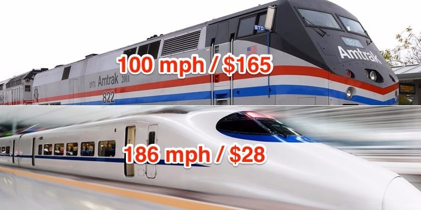 À tôi cũng muốn nói thêm là vé cho các dịch vụ tàu cao tốc ở Mỹ cũng tình cờ đắt một cách khó tin…