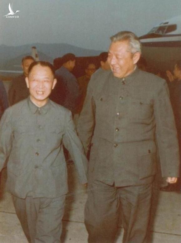 Hình dưới: Hồ Diệu Bang và Tập Trọng Huân (phải) tại sân bay Quảng Châu, xuân 1980.