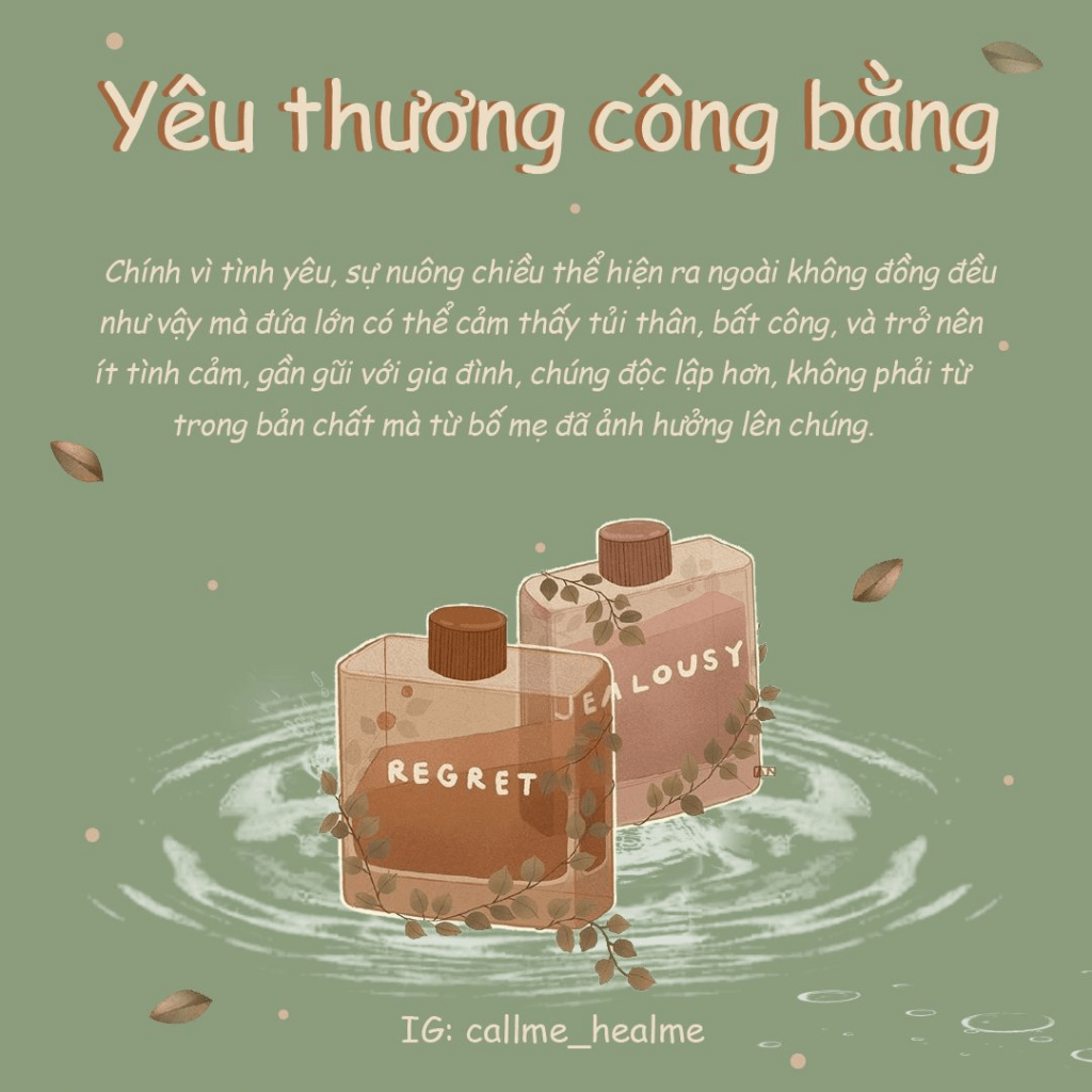 Là một người con cả trong gia đình có đứa em ít hơn tận 16 tuổi, tôi thấy may mắn khi mình đã biết suy nghĩ khi em ra đời. Không có chuyện em bắt nạt tôi hay tôi thích ký đầu em khi cáu, bố muốn tôi yêu thương em và dạy em trở thành một đứa bé ngoan chứ không phải chạy theo đáp ứng nhu cầu của nó. Còn em, tuy còn bé lắm mà vẫn biết chia sẻ món đồ chơi cho chị của nó, không giật đồ, không gào thét. Bố đã dạy nó biết tôn trọng chị và san sẻ đủ tình cảm cho đứa con gái lớn như tôi. Đó là sự công bằng để hai đứa trẻ không kèn cựa nhau trong gia đình.